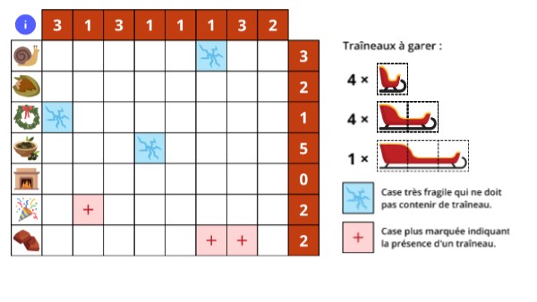 - Cliquer sur les marchandises pour les observer en plus grand. - Cliquer sur les cases de la grille pour la résoudre (trois statuts possibles : vide / point / croix). Aucune vérification automatique de la réponse. - Déplacer les traîneaux disposés sur la droite et changer leur orientation par un simple clic. /!\ Vous ne pouvez pas prendre de notes. Prenez un papier et un crayon pour cela ! ;)
