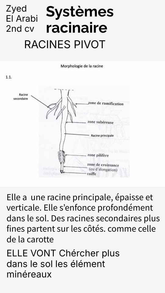 Elle a une racine principale, épaisse et verticale. Elle s’enfonce profondément dans le sol. Des racines secondaires plus fines partent sur les côtés. comme celle de la carotte