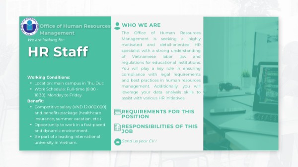 • Làm việc trong môi trường ổn định, chuyên nghiệp của trường đại học công lập.
