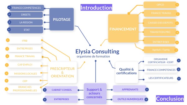 La formation professionnelle occupe aujourd’hui une place centrale dans les parcours de vie et dans l’adaptation des compétences aux transitions en cours, notamment la transition écologique et énergétique. En préparant ce dossier, j’ai cherché à mieux comprendre qui fait quoi dans ce système parfois complexe : qui finance, qui régule, qui oriente, qui contrôle, qui forme, et comment ces acteurs interagissent entre eux.À travers cette cartographie, je me place dans mon rôle au sein d’Elysia Consulting, un organisme de conseil et de formation spécialisé dans la rénovation énergétique. L’objectif de ce travail est d’une part, poser une vision claire et structurée de l’écosystème de la formation professionnelle et d’autre part, situer concrètement Elysia Consulting au sein de cet écosystème, en identifiant les partenaires, les financeurs, les prescripteurs et les obligations réglementaires qui conditionnent notre activité.Ce document présente un schéma simplifié de la cartographie des acteurs et un paragraphe explicatif pour chaque acteur (rôle + lien avec mon activité).