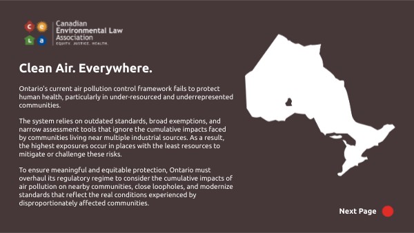 Ontario’s current air pollution control framework fails to protect human health, particularly in under-resourced and underrepresented communities. The system relies on outdated standards, broad exemptions, and narrow assessment tools that ignore the cumulative impacts faced by communities living near multiple industrial sources. As a result, the highest exposures occur in places with the least resources to mitigate or challenge these risks. To ensure meaningful and equitable protection, Ontario must overhaul its regulatory regime to consider the cumulative impacts of air pollution on nearby communities, close loopholes, and modernize standards that reflect the real conditions experienced by disproportionately affected communities.