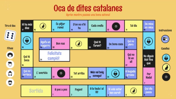 INSTRUCCIONS "OCA DE DITES CATALANES" En aquest joc, que té l'objectiu d'afavorir l'aprenentatge de dites en català per mantenir-lo més viu que mai, cada jugador haurà d'escollir una fitxa. Un cop es llença el dau i es compten les caselles que s'han d'avançar, s'haurà de picar la casella on s'ha arribat. La gran majoria d'elles tenen la meitat d'una dita popular catalana. Així doncs, el jugador haurà d'escollir entre tres opcions. Si marca la bona, podrà continuar tirant; si no, haurà de cedir el torn al següent jugador. Com a part informativa, després de saber la resposta correcta, es podrà conèixer el significat de la dita i un exemple on es pot veure què vol dir que estarà basat en una notícia recent. Tot i així, hi ha caselles especials. Si es cau en el cor amb un cadenat, es perdrà el torn automàticament. En cas d'arribar a la casella amb l'oca, la sort serà favorable, ja que es pot tornar a tirar. En canvi, si toca la casella amb el símbol negre del rellotge, s'haurà de tornar a la casella de sortida. Així, el jugador que abans arribi a la casella 34, ja sigui per sort o per pura expertesa, serà el guanyador del joc. BONA SORT!