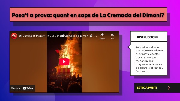 Reprodueix el vídeo per veure una mica de què tracta la festa i posat a punt per respondre les preguntes abans que s'exhaureixi el temps... Endavant!