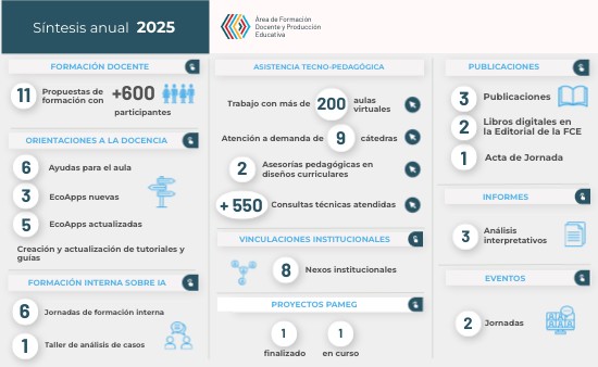 Comisión de Implementación, Seguimiento y Evaluación del Plan de Estudio (CISPE): participación institucional en los procesos de revisión, articulación y monitoreo del plan de estudios. Editorial FCE: colaboración en la producción y curaduría de materiales para la colección Formar. SIED y Red CAVILA: participación en la comisión asesora, apertura y articulación de propuestas de formación docente a nivel interfacultades, y acompañamiento a equipos docentes en la convocatoria Educa a Distancia. Universidad Nacional de Rafaela (UNRaf): inicio del trabajo conjunto para el diseño de la nueva edición de las Jornadas de Aulas Abiertas. Biblioteca Manuel Belgrano FCE, Área de Sistemas y PSI: impulso para el desarrollo de competencias técnicas de diseño de sistemas de IA y trabajo conjunto en un prototipo de chatbot de referencias bibliográficas del catálogo de la biblioteca. Área de Comunicación Institucional: colaboración en el testeo de nuevos formatos participativos para el abordaje de temáticas de interés (Calculo Que Sí). Olimpiadas de Ciencias Económicas: dictado de clase/taller sobre IA en educación para docentes del nivel secundario.Trabajo con más de 200 aulas virtuales