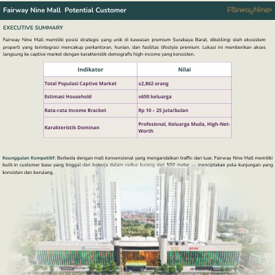 Keunggulan Kompetitif: Berbeda dengan mall konvensional yang mengandalkan traffic dari luar, Fairway Nine Mall memiliki built-in customer base yang tinggal dan bekerja dalam radius kurang dari 500 meter — menciptakan pola kunjungan yang konsisten dan berulang.