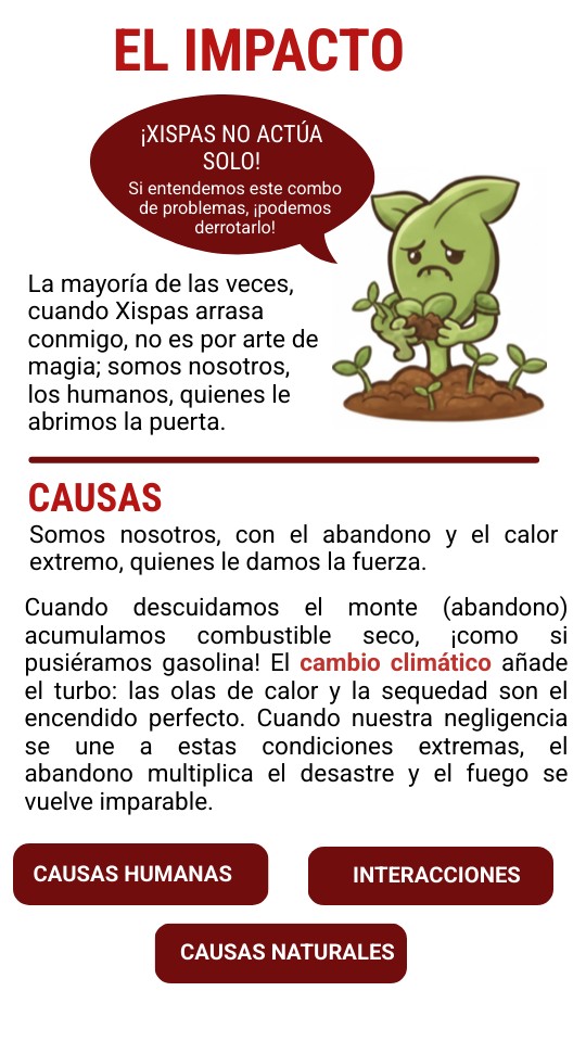 Cuando descuidamos el monte (abandono) acumulamos combustible seco, ¡como si pusiéramos gasolina! El cambio climático añade el turbo: las olas de calor y la sequedad son el encendido perfecto. Cuando nuestra negligencia se une a estas condiciones extremas, el abandono multiplica el desastre y el fuego se vuelve imparable.