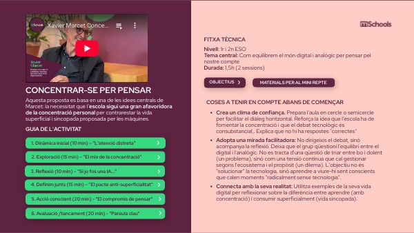 - Connecta amb la seva realitat: Utilitza exemples de la seva vida digital per reflexionar sobre la diferència entre aprendre (amb concentració) i consumir superficialment (vida sincopada).
