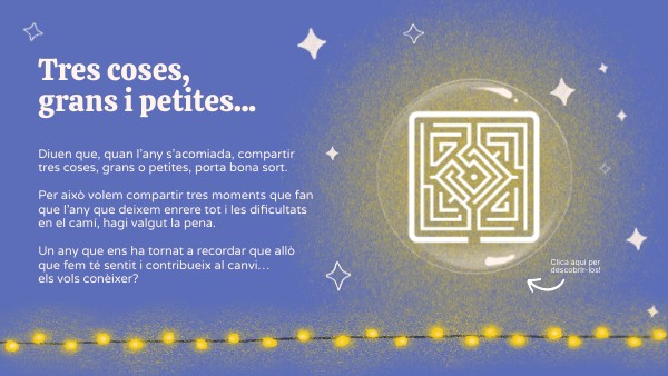 Diuen que, quan l’any s’acomiada, compartir tres coses, grans o petites, porta bona sort. Per això volem compartir tres moments que fan que l’any que deixem enrere tot i les dificultats en el camí, hagi valgut la pena. Un any que ens ha tornat a recordar que allò que fem té sentit i contribueix al canvi… els vols conèixer?