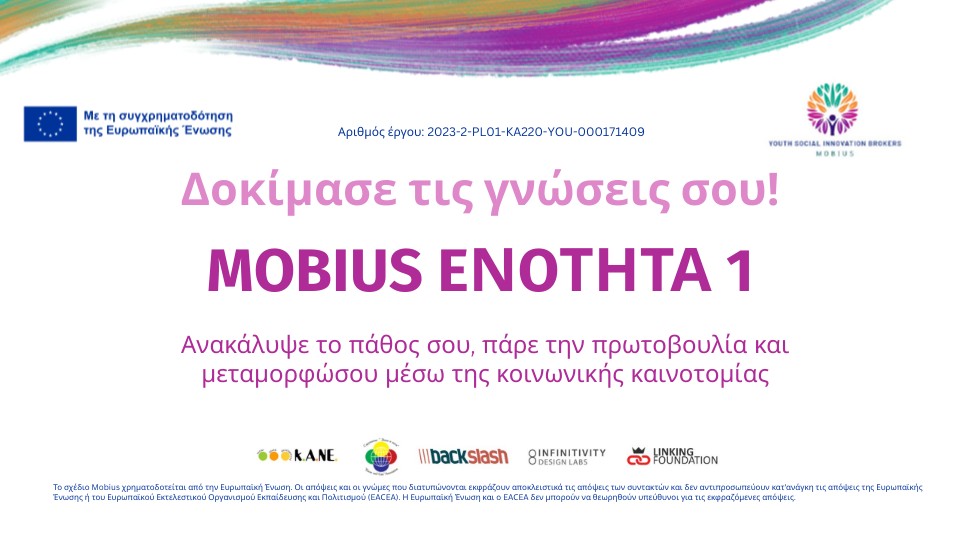 Το σχέδιο Mobius χρηματοδοτείται από την Ευρωπαϊκή Ένωση. Οι απόψεις και οι γνώμες που διατυπώνονται εκφράζουν αποκλειστικά τις απόψεις των συντακτών και δεν αντιπροσωπεύουν κατ'ανάγκη τις απόψεις της Ευρωπαϊκής Ένωσης ή του Ευρωπαϊκού Εκτελεστικού Οργανισμού Εκπαίδευσης και Πολιτισμού (EACEA). Η Ευρωπαϊκή Ένωση και ο EACEA δεν μπορούν να θεωρηθούν υπεύθυνοι για τις εκφραζόμενες απόψεις.