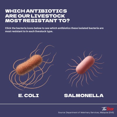 Click the bacteria icons below to see which antibiotics these isolated bacteria are most resistant to in each livestock type.