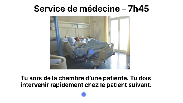 Tu sors de la chambre d’une patiente. Tu dois intervenir rapidement chez le patient suivant.
