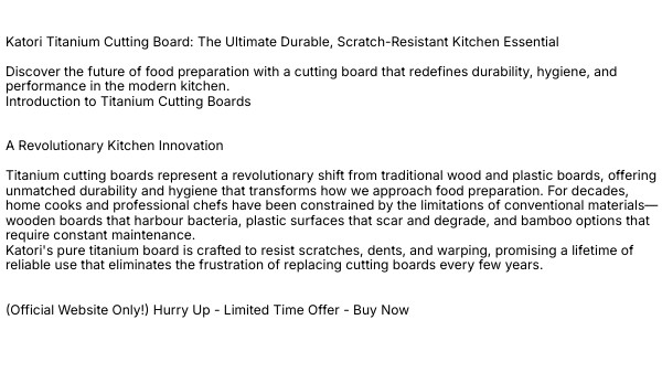 Katori Titanium Cutting Board: The Ultimate Durable, Scratch-Resistant Kitchen Essential Discover the future of food preparation with a cutting board that redefines durability, hygiene, and performance in the modern kitchen. Introduction to Titanium Cutting Boards A Revolutionary Kitchen Innovation Titanium cutting boards represent a revolutionary shift from traditional wood and plastic boards, offering unmatched durability and hygiene that transforms how we approach food preparation. For decades, home cooks and professional chefs have been constrained by the limitations of conventional materials—wooden boards that harbour bacteria, plastic surfaces that scar and degrade, and bamboo options that require constant maintenance. Katori's pure titanium board is crafted to resist scratches, dents, and warping, promising a lifetime of reliable use that eliminates the frustration of replacing cutting boards every few years. (Official Website Only!) Hurry Up - Limited Time Offer - Buy Now