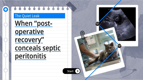 Ongoing lethargy and poor appetite were treated symptomatically Clinical reassessment and confirmatory testing for peritonitis were delayed. Cat re-presented in shock; anastomotic dehiscence and diffuse septic peritonitis