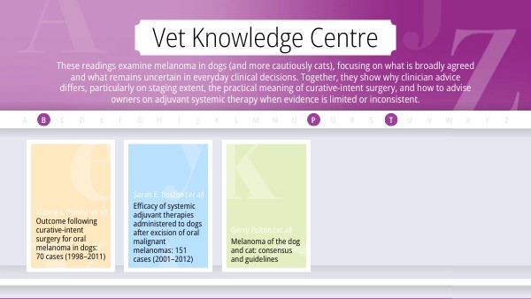 These readings examine melanoma in dogs (and more cautiously cats), focusing on what is broadly agreed and what remains uncertain in everyday clinical decisions. Together, they show why clinician advice differs, particularly on staging extent, the practical meaning of curative-intent surgery, and how to advise owners on adjuvant systemic therapy when evidence is limited or inconsistent.