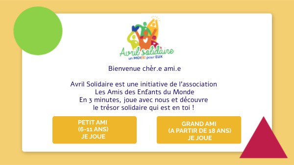 Bienvenue chèr.e ami.e Avril Solidaire est une initiative de l'association Les Amis des Enfants du Monde En 3 minutes, joue avec nous et découvre le trésor solidaire qui est en toi !