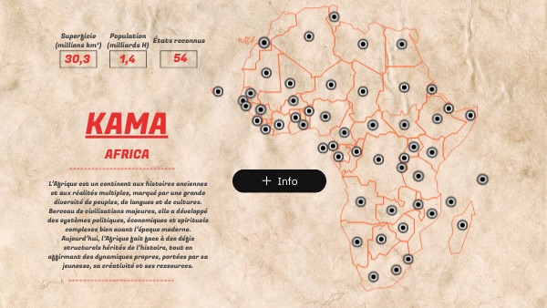 L’Afrique est un continent aux réalités multiples, façonné par des histoires anciennes, des peuples nombreux et des cultures dynamiques. Berceau de civilisations majeures, elle ne se résume ni à la colonisation ni aux crises contemporaines. Cette carte interactive s'insrit dans le cadre d'un projet qui propose une lecture globale de l’Afrique, pour mieux comprendre ses diversités, ses héritages et ses dynamiques actuelles.