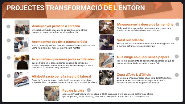 Amb aquest projecte de cohesió comunitària, on intercooperem amb la Taula d’Entitats de la Marina i el projecte “La Marina ens cuidem”, s'ha creat dins del CAI Zona Franca, un servei per a persones en situació de sensellar, un espai d'aprenentatge, lúdic, de co-creació i d'introducció a la diversitat d’oportunitats del mon laboral amb l'objectiu de fomentar la connexió intergeneracional i intercultural del barri, l'intercanvi de coneixement, la impulsió de sinergies, l’oci terapèutic i el desenvolupament i autorealització personal i del grup. Així doncs, està dissenyat per a que persones amb diferents perfils puguin aprendre, compartir i entretenir-se en activitats pràctiques que introdueixin als diferents oficis i artesanies per posar el focus en el desenvolupament d’habilitats, el coneixement d’alternatives laborals, el llenguatge propi de cada ofici i la integració sociolaboral.