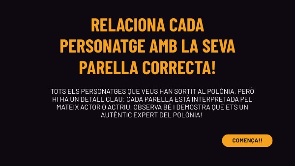 Tots els personatges que veus han sortit al Polònia, però hi ha un detall clau: cada parella està interpretada pel mateix actor o actriu. Observa bé i demostra que ets un autèntic expert del Polònia!