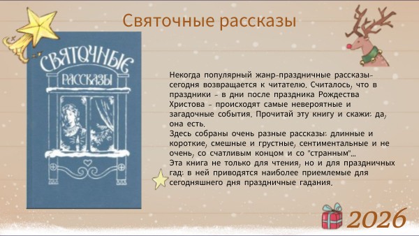 Некогда популярный жанр-праздничные рассказы-сегодня возвращается к читателю. Считалось, что в праздники - в дни после праздника Рождества Христова - происходят самые невероятные и загадочные события. Прочитай эту книгу и скажи: да, она есть. Здесь собраны очень разные рассказы: длинные и короткие, смешные и грустные, сентиментальные и не очень, со счатливым концом и со "странным"... Эта книга не только для чтения, но и для праздничных гад: в ней приводятся наиболее приемлемые для сегодняшнего дня праздничные гадания.