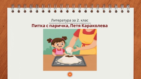 Питка с паричка Сякаш силен вятър е навял бяла пряспа в кръглата тавичка - туй е питка содена с паричка. Мама с чиста кърпа я покри, нека втаса, нека се надигне и за всеки у дома да стигне. - Втасвай с нея - моля се наум, - скрита вътре, мъничка паричко, че една си за късмет на всички...