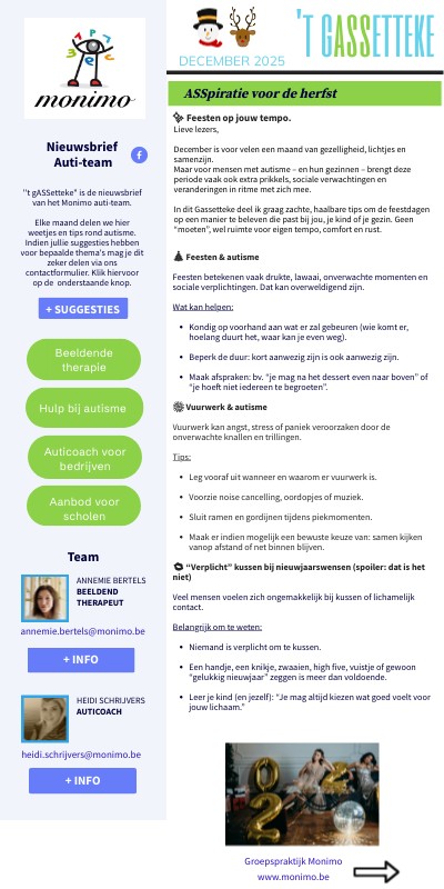 ''t gASSetteke" is de nieuwsbrief van het Monimo auti-team. Elke maand delen we hier weetjes en tips rond autisme. Indien jullie suggesties hebben voor bepaalde thema's mag je dit zeker delen via ons contactformulier. Klik hiervoor op de onderstaande knop.