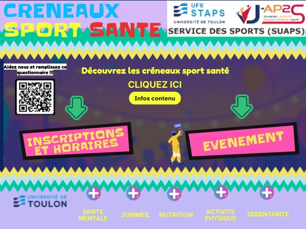 Vous cherchez à pratiquer une activité physique pour améliorer votre santé ? Découvrez les créneaux de sport santé, pratiquer des activités encadrées au sein de l'Université de Toulon et sur le campus de La Garde. Lien pour vous inscrire !