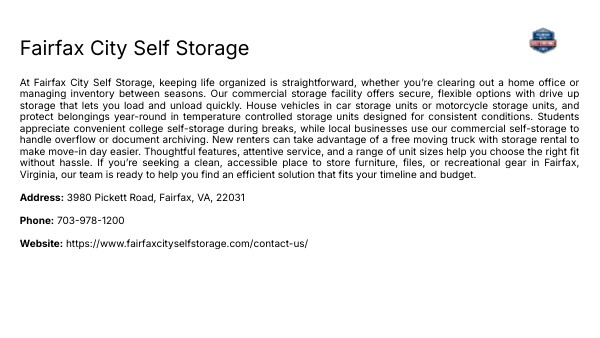 At Fairfax City Self Storage, keeping life organized is straightforward, whether you’re clearing out a home office or managing inventory between seasons. Our commercial storage facility offers secure, flexible options with drive up storage that lets you load and unload quickly. House vehicles in car storage units or motorcycle storage units, and protect belongings year-round in temperature controlled storage units designed for consistent conditions. Students appreciate convenient college self-storage during breaks, while local businesses use our commercial self-storage to handle overflow or document archiving. New renters can take advantage of a free moving truck with storage rental to make move-in day easier. Thoughtful features, attentive service, and a range of unit sizes help you choose the right fit without hassle. If you’re seeking a clean, accessible place to store furniture, files, or recreational gear in Fairfax, Virginia, our team is ready to help you find an efficient solution that fits your timeline and budget.Address: 3980 Pickett Road, Fairfax, VA, 22031Phone: 703-978-1200Website: https://www.fairfaxcityselfstorage.com/contact-us/