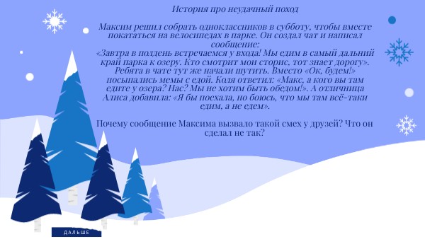 История про неудачный поход Максим решил собрать одноклассников в субботу, чтобы вместе покататься на велосипедах в парке. Он создал чат и написал сообщение: «Завтра в полдень встречаемся у входа! Мы едим в самый дальний край парка к озеру. Кто смотрит мои сторис, тот знает дорогу». Ребята в чате тут же начали шутить. Вместо «Ок, будем!» посыпались мемы с едой. Коля ответил: «Макс, а кого вы там едите у озера? Нас? Мы не хотим быть обедом!». А отличница Алиса добавила: «Я бы поехала, но боюсь, что мы там всё-таки едим, а не едем». Почему сообщение Максима вызвало такой смех у друзей? Что он сделал не так?