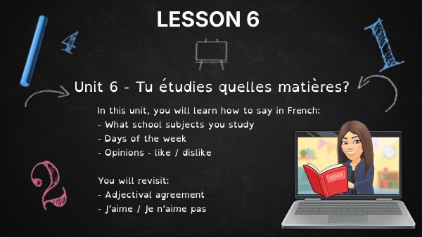 In this unit, you will learn how to say in French: - What school subjects you study - Days of the week - Opinions - like / dislike You will revisit: - Adjectival agreement - J’aime / Je n’aime pas