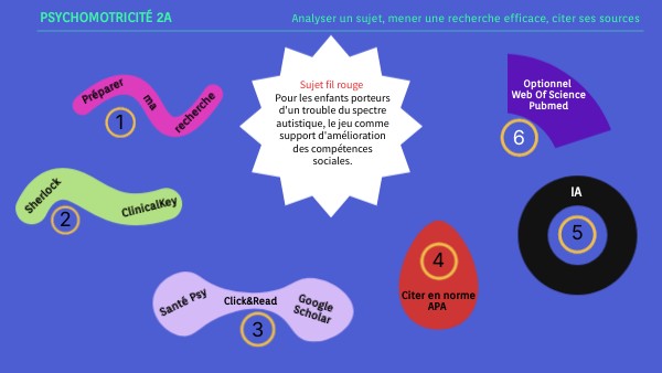 Qui : enfants, y compris jeunes enfants. Quoi : manipulation de jeux seul ou en groupe. Quand : pour la partie recherche théorique la documentation privilégiée < 20 ans. Puis observation durant le stage. Où : écoles maternelles ou primaires, lieux d'exercice de la profession de psychomotriciens (IME, MAS...) Comment : - partie théorique : travail de recherche sur des bases de données identifiées (CAIRN, Santépsy, Lissa + thèses), catalogues, moteurs de recherche (Google Scholar) + revues professionnelles et livres de la profession - partie pratique : techniques d'observation, questionnaires... Pourquoi : Mini-mémoire, méthodologie de recherche, forme académique (organisation du mémoire, référencement bibliographique norme APA...).