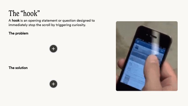 A hook is an opening statement or question designed to immediately stop the scroll by triggering curiosity.