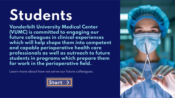 Vanderbilt University Medical Center (VUMC) is committed to engaging our future colleagues in clinical experiences which will help shape them into competent and capable perioperative health care professionals as well as outreach to future students in programs which prepare them for work in the perioperative field.