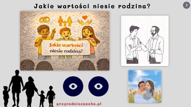 Grupa zostaje poproszona o przygotowanie krótkich pytań lub zagadek dotyczących praw i obowiązków członków rodziny oraz sposobów dbania o więzi rodzinne. Przykładowe pytanie: „Jakie obowiązki ma dziecko wobec rodziców?” albo „Wymień trzy sposoby na okazywanie miłości rodzinie”. Po przygotowaniu pytań każdy zespół prowadzi quiz dla pozostałych grup (np. w formie konkursu z nagrodami punktowymi). Jeśli czas pozwoli, można dodać trzecie zadanie, np. prostą scenkę lub kalambury ilustrujące dobre i złe zachowania w rodzinie, pod nazwą „Teatrzyk rodzinnych uczuć” - uczniowie prezentują krótkie scenki pokazujące, co pomaga, a co psuje atmosferę w domu.)
