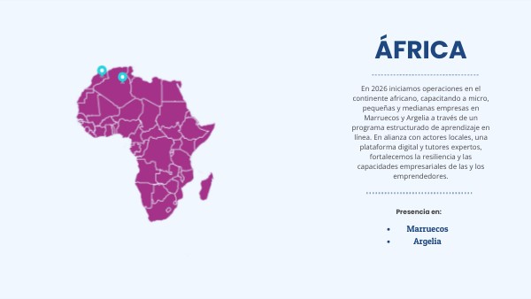 En 2026 iniciamos operaciones en el continente africano, capacitando a micro, pequeñas y medianas empresas en Marruecos y Argelia a través de un programa estructurado de aprendizaje en línea. En alianza con actores locales, una plataforma digital y tutores expertos, fortalecemos la resiliencia y las capacidades empresariales de las y los emprendedores.