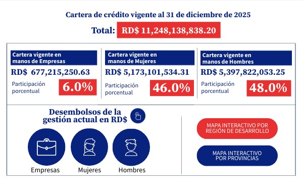 Cartera de crédito vigente al 31 de dicembre 2025, por monto, participación porcentual y sexo, según provincia