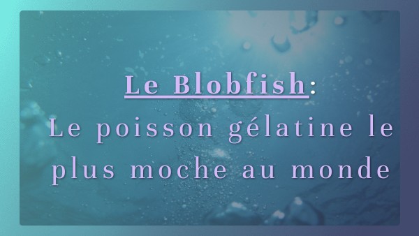 Son alimentation: Le blobfish est un poisson qui vit très profond dans l'océan. Là-bas, il fait très sombre et il n'y a pas beaucoup de nourriture. Le blobfish ne chasse pas comme les autres poissons. Il bouge très peu et il reste tranquille. Pour manger, il attend que la nourriture passe devant lui. Il mange des petits animaux marins, comme des petits crustacés, par exemple des petits crabes, des mollusques et d'autres petites bêtes de la mer. Il avale la nourriture sans courir après.