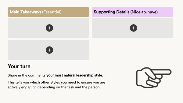 Share in the comments your most natural leadership style. This tells you which other styles you need to ensure you are actively engaging depending on the task and the person.