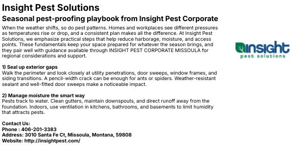 When the weather shifts, so do pest patterns. Homes and workplaces see different pressures as temperatures rise or drop, and a consistent plan makes all the difference. At Insight Pest Solutions, we emphasize practical steps that help reduce harborage, moisture, and access points. These fundamentals keep your space prepared for whatever the season brings, and they pair well with guidance available through INSIGHT PEST CORPORATE MISSOULA for regional considerations and support. 1) Seal up exterior gaps Walk the perimeter and look closely at utility penetrations, door sweeps, window frames, and siding transitions. A pencil-width crack can be enough for ants or spiders. Weather-resistant sealant and well-fitted door sweeps make a noticeable impact. 2) Manage moisture the smart way Pests track to water. Clean gutters, maintain downspouts, and direct runoff away from the foundation. Indoors, use ventilation in kitchens, bathrooms, and basements to limit humidity that attracts pests. Contact Us: Phone : 406-201-3383 Address: 3010 Santa Fe Ct, Missoula, Montana, 59808 Website: http://insightpest.com/