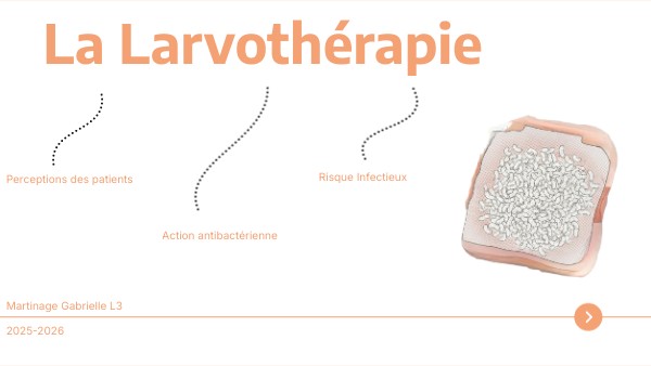Arora, S., Baptista, C., & Lim, C. S. (2011). Maggot metabolites and their combinatory effects with antibiotic on Staphylococcus aureus. Annals of Clinical Microbiology and Antimicrobials, 10, 6. https://doi.org/10.1186/1476-0711-10-6 McCaughan, D. et al. (2013). Patients’ perceptions and experiences of venous leg ulceration and their attitudes to larval therapy: An in‑depth qualitative study. Health Expectations. (Version intégrale disponible sur PubMed Central). https://www.ncbi.nlm.nih.gov/pmc/articles/PMC5060795/ Bueide, P., Hunt, J., Bande, D., & Guerrero, D. M. (2021). Maggot wound therapy associated with Wohlfahrtiimonas chitiniclastica blood infection. Cureus Journal of Medical Science. https://www.ncbi.nlm.nih.gov/pmc/articles/PMC7854341/ Wolff, H., & Hansson, C. (2003). Larval therapy – an effective method of ulcer debridement. Clinical and Experimental Dermatology, 28(2), 134–137. https://doi.org/10.1046/j.1365-2230.2003.01226.x