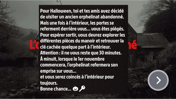 Pour Halloween, toi et tes amis avez décidé de visiter un ancien orphelinat abandonné.Mais une fois à l’intérieur, les portes se referment derrière vous… vous êtes piégés. Pour espérer sortir, vous devrez explorer les différentes pièces du manoir et retrouver la clé cachée quelque part à l’intérieur. Attention : il ne vous reste que 30 minutes. À minuit, lorsque le 1er novembre commencera, l’orphelinat refermera son emprise sur vous… et vous serez coincés à l’intérieur pour toujours. Bonne chance… 🎃🔑