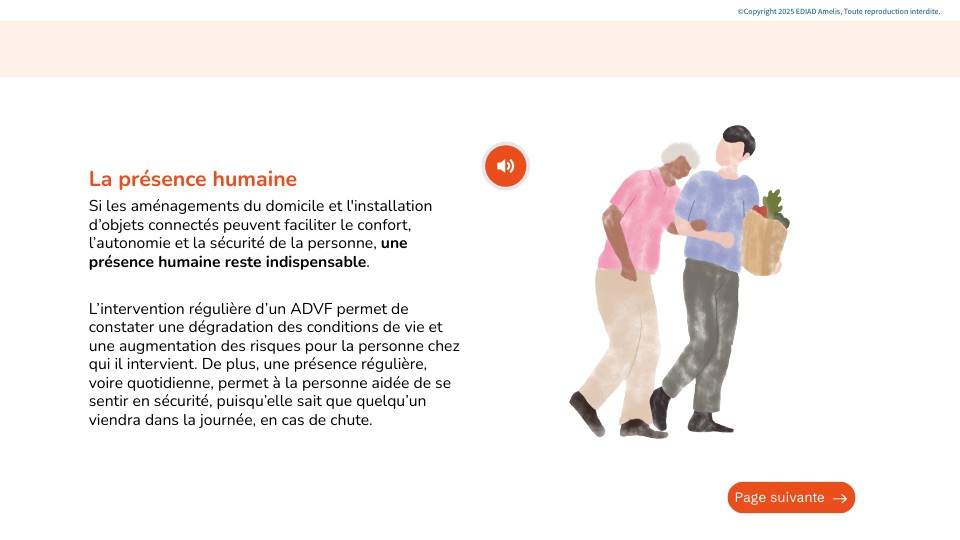 Si les aménagements du domicile et l'installation d’objets connectés peuvent faciliter le confort, l’autonomie et la sécurité de la personne, une présence humaine reste indispensable. L’intervention régulière d’un ADVF permet de constater une dégradation des conditions de vie et une augmentation des risques pour la personne chez qui il intervient. De plus, une présence régulière, voire quotidienne, permet à la personne aidée de se sentir en sécurité, puisqu’elle sait que quelqu’un viendra dans la journée, en cas de chute.