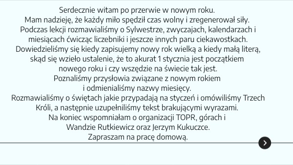 Serdecznie witam po przerwie w nowym roku. Mam nadzieję, że każdy miło spędził czas wolny i zregenerował siły. Podczas lekcji rozmawialiśmy