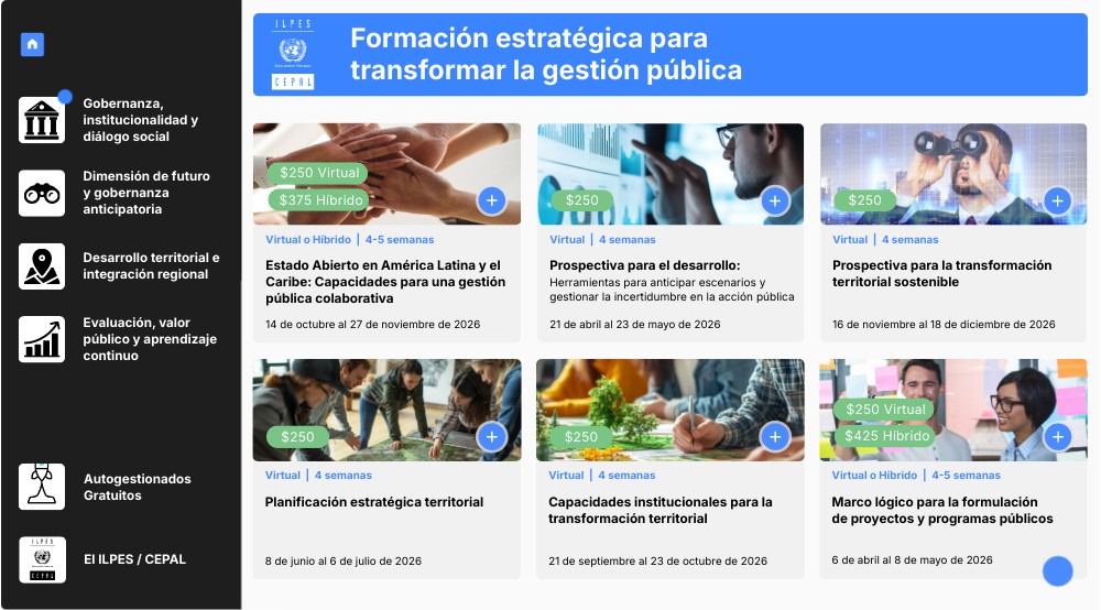 El ILPES es el centro de la CEPAL especializado en planificación y gestión pública. Desarrolla procesos de formación y asistencia técnica, articulando investigación y metodologías aplicadas para fortalecer las capacidades institucionales de los Estados de la región.Su oferta formativa combina cursos virtuales, híbridos y autogestionados con capacitaciones institucionales, organizadas en áreas temáticas estratégicas.