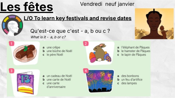 le festival festival Epiphanie Epiphany un anniversaire a birthday la tradition tradition le lundi de Paques Easter Monday une recette a recipe culturel(le) cultural la Fête des Mères Mothers' Day des bonbons sweets fêter to celebrate Bonne Année ! Happy New Year! des crêpes pancakes des biscuits biscuits