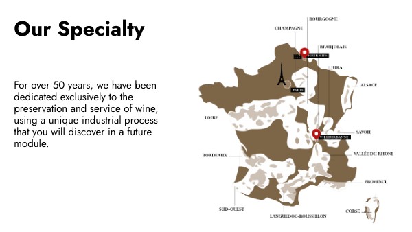 For over 50 years, we have been dedicated exclusively to the preservation and service of wine, using a unique industrial process that you will discover in a future module.