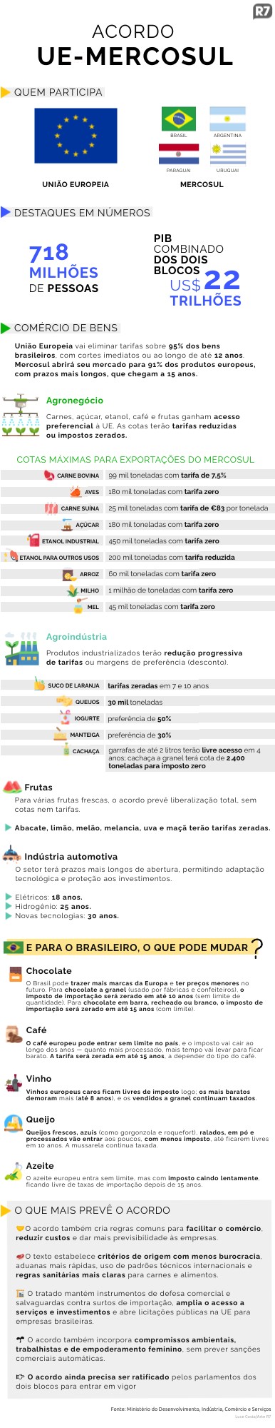 União Europeia vai eliminar tarifas sobre 95% dos bens brasileiros, com cortes imediatos ou ao longo de até 12 anos. Mercosul abrirá seu mercado para 91% dos produtos europeus, com prazos mais longos, que chegam a 15 anos.