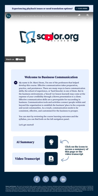 My name is Dr. Marci Stone, I’m one of the professors that helped develop this course. Effective communication takes preparation, practice, and persistence. There are many ways to learn communication skills; the school of experience, or 'hard knocks', is one of them. But in the business environment, a 'knock' (or lesson learned) may come at the expense of your credibility through a blown presentation to a client.Effective communication skills are a prerequisite for succeeding in business. Communication tools and activities connect people within and beyond the organization to establish the business' place in the corporate and social communities. As a result, communication needs to be consistent, effective, and customized for the business to prosper. You can start by reviewing the course learning outcomes and the syllabus, you can find both on the left navigation panel. Let’s get started!