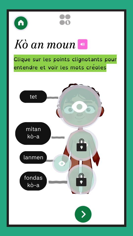 Clique sur les points clignotants pour entendre et voir les mots créoles