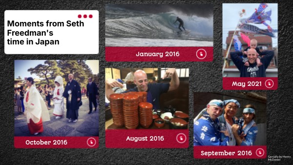 Freedman celebrates a successful matsuri, or festival, with his work and the event's organizer in Kanagawa Prefecture, Japan. In the Shinto festival, according to Sakuraco, volunteers carry portable Shinto shrines, or mikoshi, on routes through neighbourhoods and other areas to honour and spread the influence of the deities that are decidated. Photo Courtesy of Seth Freedman
