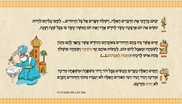 יָּמִים אֲשֶׁר נָחוּ בָהֶם הַיְּהוּדִים מֵאֹיְבֵיהֶם וְהַחֹדֶשׁ אֲשֶׁר נֶהְפַּךְ לָהֶם מִיָּגוֹן לְשִׂמְחָה וּמֵאֵבֶל לְיוֹם טוֹב, לַעֲשׂוֹת אוֹתָם יְמֵי מִשְׁתֶּה וְשִׂמְחָה וּמִשְׁלֹחַ מָנוֹת אִישׁ לְרֵעֵהוּ וּמַתָּנוֹת לָאֶבְיֹנִים.[...]
